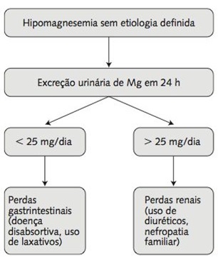 Quando a causa da hipomagnesemia não puder ser evidenciada imediatamente, pode-se utilizar essa rotina diagnóstica diferencial: